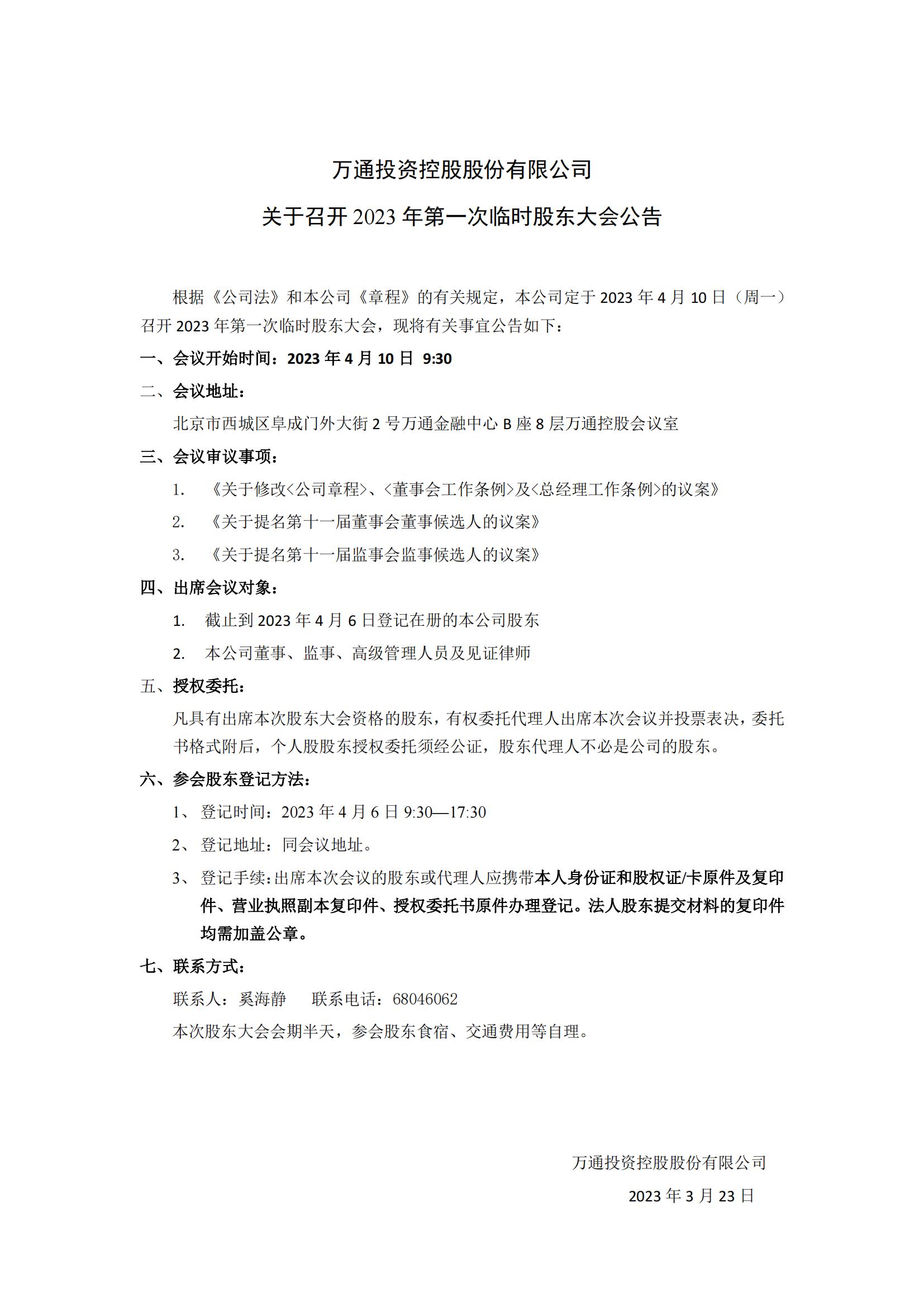 关于召开2023年第一次临时股东大会公告